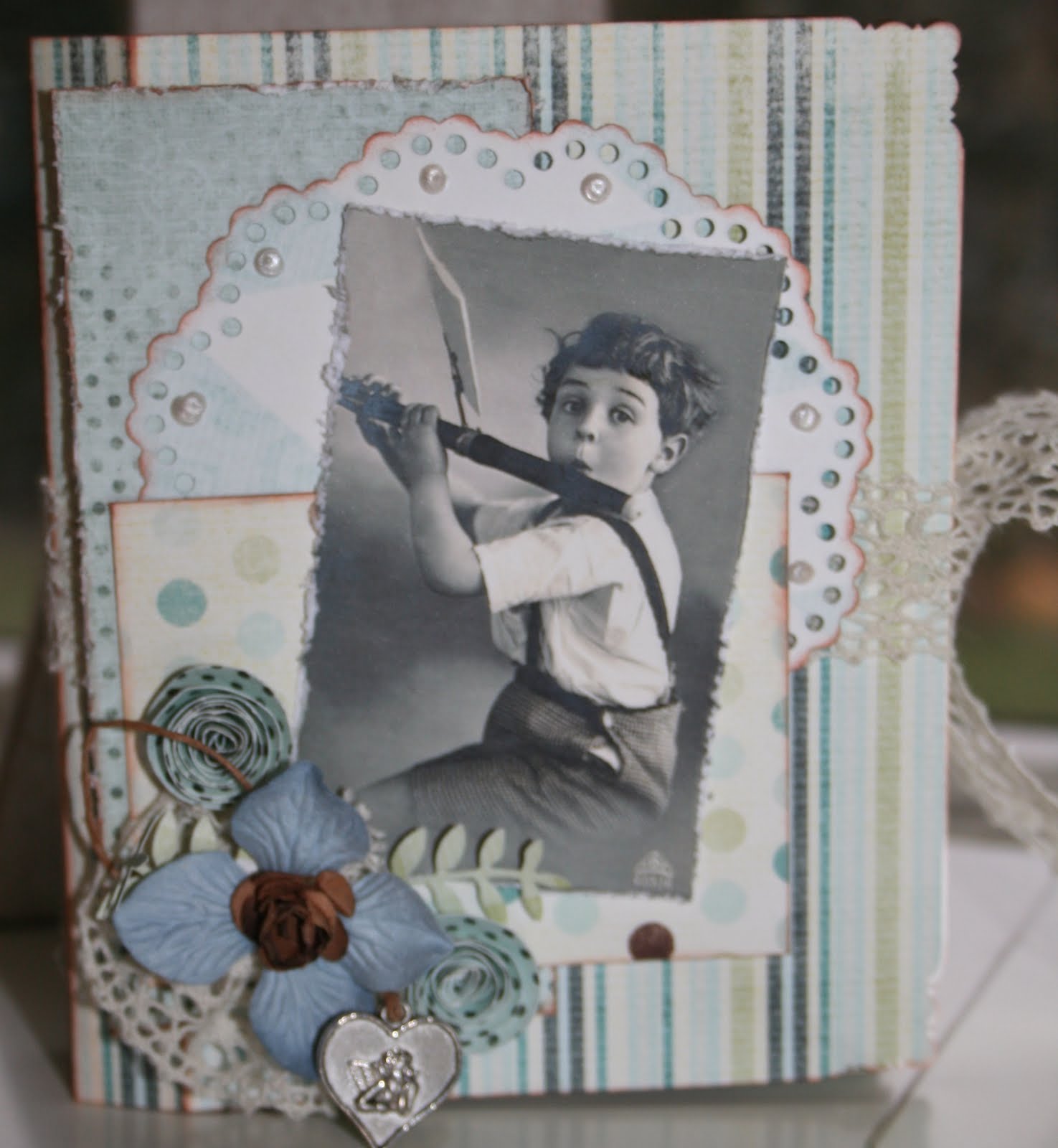 Het moest ook nog "strak" zijn en niet "katholiek", en als het kon in de kleuren blauw, wit, zilver ppfff. Dit is wat ik er van heb gemaakt, een leuke easelkaart met prachtig papier van MME en een schattige foto van het kindje dat gedoopt word.